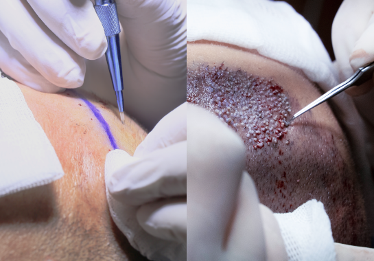 Lorsque l’on emploie la technique d’extraction folliculaire unitaire (FUE), tout se déroule en trois phases. Les follicules pileux sont extraits en premier à l’aide d’un punch. Le praticien crée ensuite des micro-incisions dans la zone à traiter. Ce n’est qu’après cette opération que les greffons sont implantés au moyen d’une aiguille.